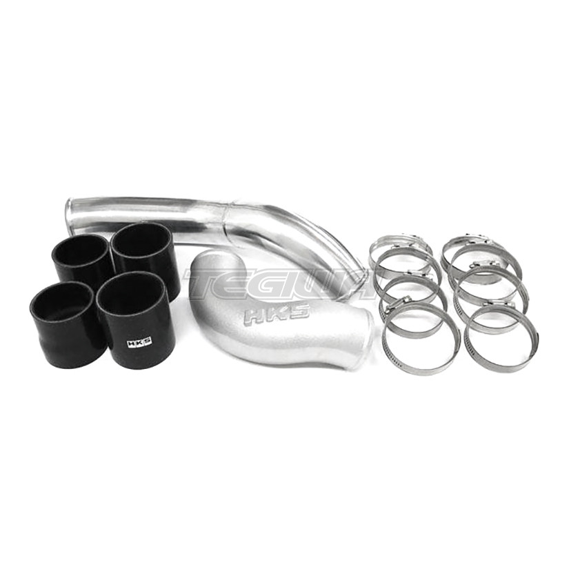 HKS Intercooler Pipe Kit. Replacing the rubber inlet & outlet hoses with aluminum hoses restrains its expansion to improve the throttle response and smoothly increase the boost pressure. Also, aluminium hoses can be securely connected even under a high pressure. Factory rubber hoses are replaced with aluminium pipes and silicone joint hoses, and they are secured with reinforced hose bands. HKS original casting inlet pipe allows smooth layout.